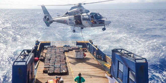 A French Navy helicopter operates by a seized fishing vessel at a location in the South Pacific.