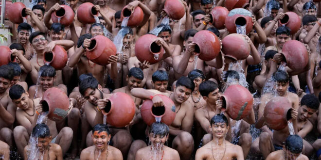 Home / Photo / Ahmedabad, India Students of the Swaminarayan Gurukul school demonstrate for the media a purification bath ritual, which is believed to absolve them of their sins