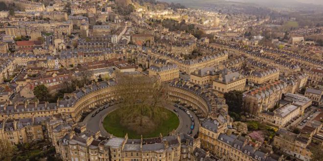 Bath, England Early morning mist and low cloud cover the city and surrounding hills