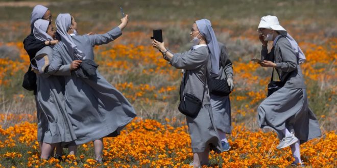 Home / Photo / California, US Visitors take selfies in a field of poppies and wildflowers outside the Antelope Valley California Poppy Reserve. The California Department of Water Resources reported that about one-third of the Sierra Nevada snowpack’s water equivalency melted last week under higher-than-normal temperatures