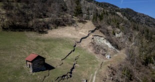 Vissoie, Switzerland This aerial photograph captures the Fios faultline in the Val d’Anniviers, canton of Valais. The fracture is widening, raising fears that part of the mountainside could collapse, potentially blocking the river below and causing flooding downstream Photo Read More » Share Twitter