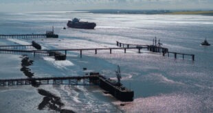 Essex, UK A container ship makes its way past the Oikos bulk liquid fuel storage facility on Canvey Island as it heads towards the London Gateway port Photo Read More » Share Twitter