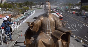 A worker sprays water to wash the bronze statue of King Sejong in Seoul Photo Read More » Share Twitter