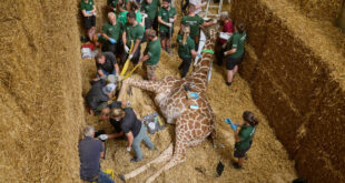 Vets and nurses at ZSL Whipsnade zoo monitor Bashu, a giraffe undergoing a hoof operation under general anaesthetic Photo Read More » Share Twitter