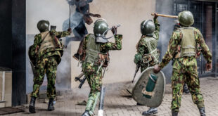 A protester jumps for safety as Kenyan police officers strike her in Nairobi. Photo Read More » Share Twitter