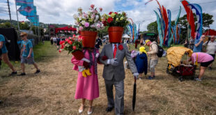 Glastonbury, UK People with flowerpots as heads are seen during the Glastonbury Festival at Worthy Farm in Somerset Photo Read More » Share Twitter