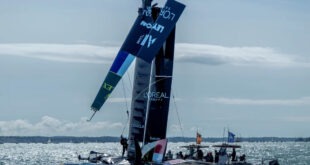 Portsmouth, UK The France SailGP team, helmed by Quentin Delapierre, suffer a damaged wing on race day one of the Great Britain Sail Grand Prix Photo Read More » Share Twitter