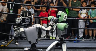 Shanghai, China Revellers watch a boxing match between two remote-controlled robots by Unitree Robotics during the World Artificial Intelligence Conference Photo Read More » Share Twitter