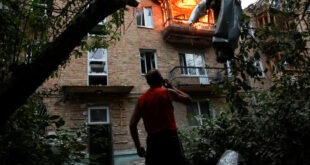 Kyiv, Ukraine A person looks on at the site of an apartment building hit during Russian missile and drone strikes Photo Read More » Share Twitter