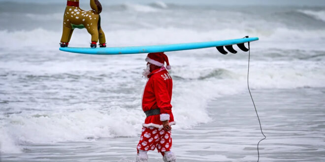 Cocoa Beach, Florida A surfer dressed as Father Christmas takes part in the annual Surfing Santas event