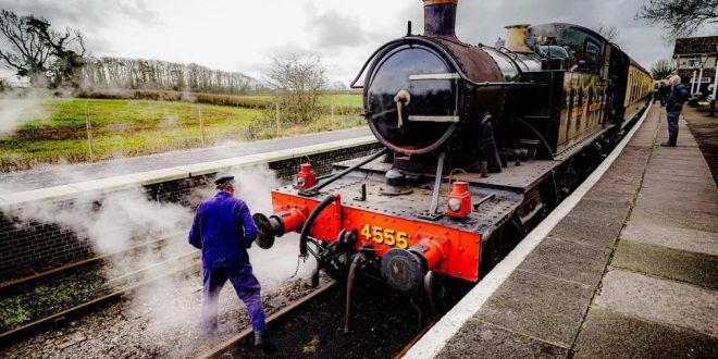 Cranmore, UK A train driver checks Locomotive 4555 as it steams up and prepares to pull out of the platform at station on the East Somerset Railway, as steam weekends begin to return to normality after the coronavirus pandemic and heritage railways gear up for the Spring season across the country