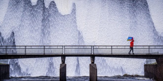 Cumbria, UK A walker’s umbrella is blown inside out as she crosses the bridge at Wet Sleddale reservoir