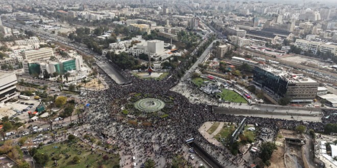 Damascus, Syria A drone view shows people gathering on the day of a military parade, as Syrians mark the first anniversary of Bashar al-Assad’s fall