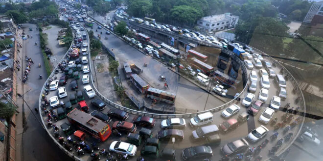 Dhaka, Bangladesh Vehicles stuck in a traffic jam as reports show over the last 10 years that the average traffic speed has dropped from 13 mph to 4 mph, only slightly above the average walking speed