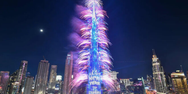 Dubai, United Arab Emirates New year fireworks light the Burj Khalifa tower at midnight.
