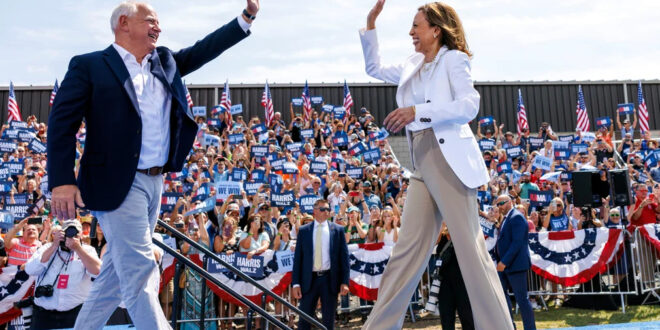 Home / Photo / Eau Claire, US Kamala Harris, vice-president and Democratic presidential nominee, is welcomed by running mate Tim Walz, the Minnesota governor, before she speaks at a campaign rally in Wisconsin