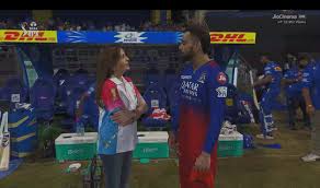 कयासों का बाजार गर्म, क्या कोहली करेंगे मुंबई जॉइन? – वायरल तस्वीर की बात करें तो विराट कोहली और रॉयल चैलेंजर्स बैंगलोर के लिए यह एक और भूलने वाली रात थी। आरसीबी की टीम वानखेड़े में मुंबई इंडियंस से हार गई और सीजन में अपनी पांचवीं हार थी। अपमानजनक हार के बाद कोहली को डगआउट के पास एमआई की मालकिन नीता अंबानी से बात करते देखा गया। हालांकि, यह पहला मौका नहीं है, जब किसी टीम की ओनर और दूसरे टीम का खिलाड़ी बात रहा हो। इससे पहले नीता अंबानी और एमएस धोनी को भी अक्सर मैच के बाद बात करते देखा गया है। इसी तरह से KKR के मालिक शाहरुख खान दिल्ली कैपिटल्स के कप्तान ऋषभ पंत से मिलने गए थे।