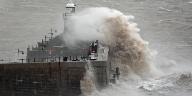 Folkestone, England Waves crash against the harbour wall in stormy weather