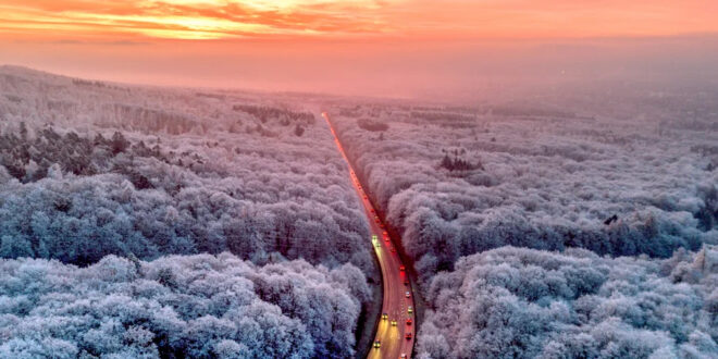 Frankfurt, Germany Commuters drive through a frozen forest toward the fog-shrouded city