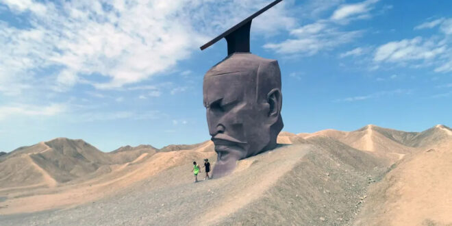 Gansu province, China A 12.5-metre-high sculpture of Emperor Wu of Han in Guazhou. The main material is red sandstone which was carved in blocks using 3D scanning and digital technology