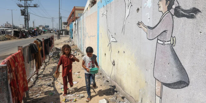 Gaza Strip Palestinian children walk past a mural at a makeshift displacement camp in Deir al-Balah
