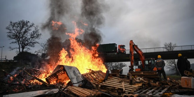 Gironde, France Farmers union members gather by a bonfire at a blockade of the A63 near Bordeaux as protests continue against the government’s mandatory cull of cattle herds affected by lumpy skin disease