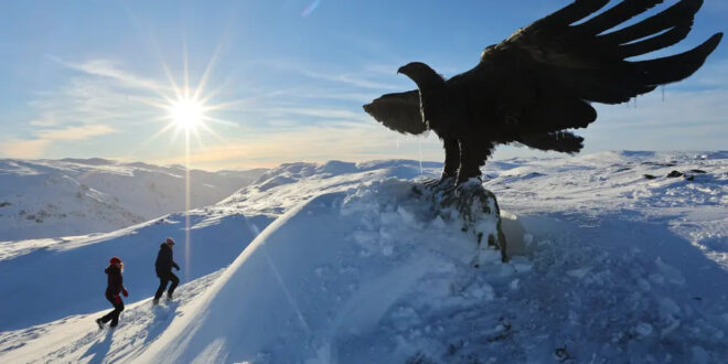 Glendoe, Scotland A 12 feet-wide bronze golden eagle sculpture, crafted by artist Tom Mackie