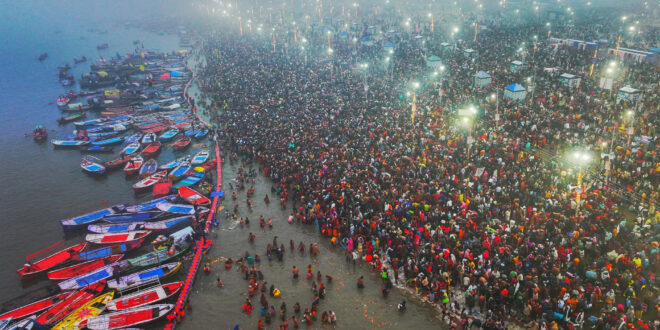 Home / Photo / Hindu pilgrims take a dip in the sacred waters of the Triveni Sangam, the confluence of the Ganges, Yamuna and mythical Saraswati rivers. Photograph: Uttar Pradesh State Information