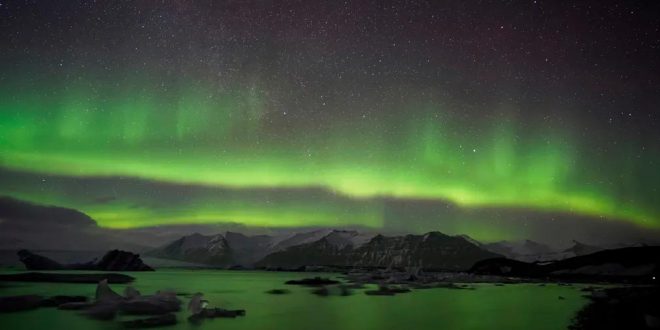 Jokulsarlon, Iceland The northern lights and the Milky Way appear over the glacial lagoon on the border of Vatnajökull national park in south-east Iceland
