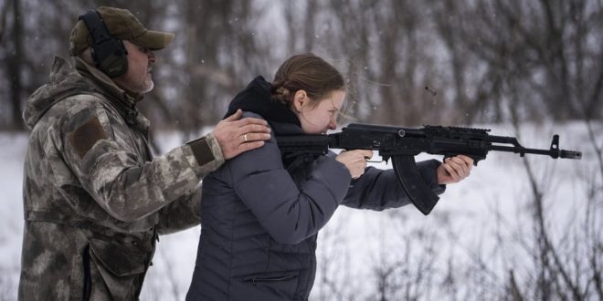 Kharkiv, Ukraine An instructor trains a woman to use a Kalashnikov assault rifle at a shooting range