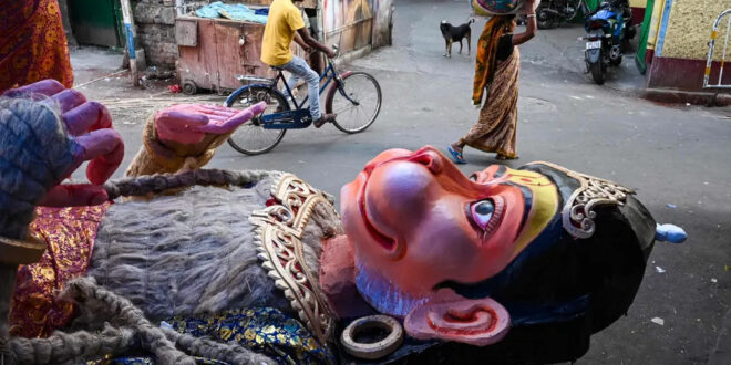 Kolkata, India People wander past a partially finished statue of the Hindu god Lord Hanuman outside a workshop, ahead of the Hanuman Jayanti festival