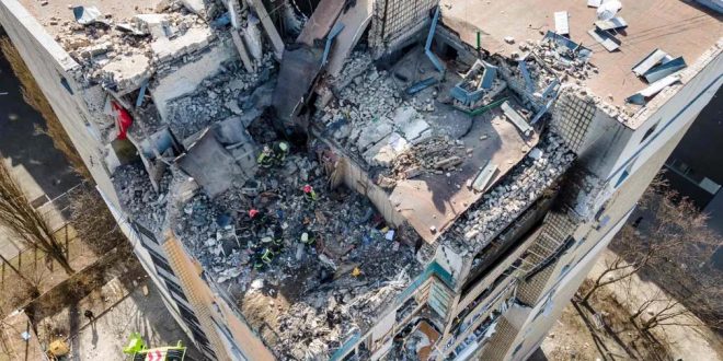 Kyiv, Ukraine Firefighters amid the rubble of a residential building that was hit by debris from a downed rocket