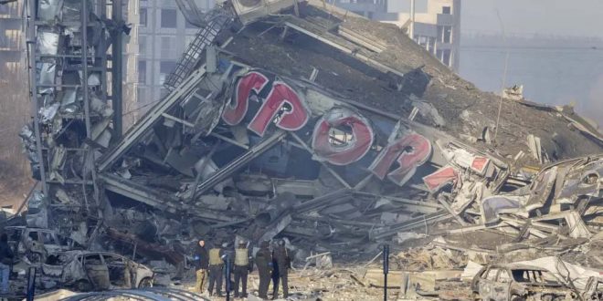 Kyiv, Ukraine People examine the damage after shelling of a shopping centre. Follow the live blog here