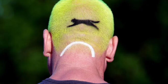Home / Photo / London, UK A fan at Southfields station with hair in the style of a tennis ball, on day one of the 2024 Wimbledon Championships