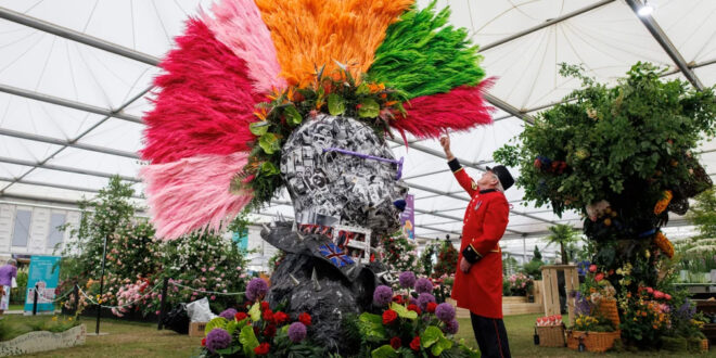 Home / Photo / London, UK Chelsea pensioner Peter Wilson poses with a floral installation of a punk sporting a mohawk hairstyle, made of pampas grass, tropical blooms and preserved leaves by Ricky Paul Flowers at the Chelsea flower show