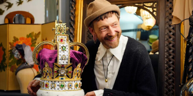 Home / Photo / London, UK Milliner Justin Smith poses with a crown he has created using 319 Scrabble tiles to mark Scrabble’s 75th anniversary and King Charles III’s coronation