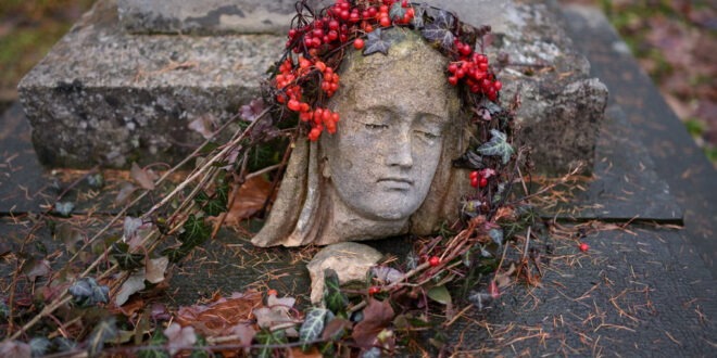 Lviv, Ukraine The head of a damaged sculpture, garlanded with ivy leaves and berries, lies on the gravestone at the Lychakiv cemetery
