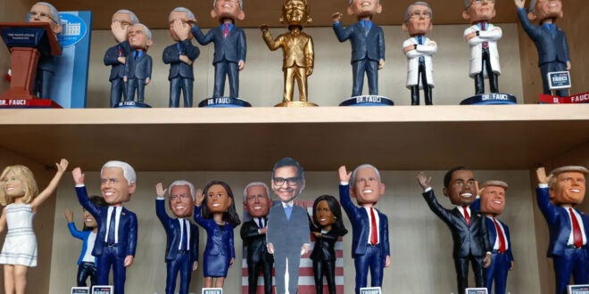 Milwaukee, US A newly designed bobblehead cutout of recently elected Republican congressman from New York, George Santos (below centre), is displayed at the National Bobblehead Hall of Fame and Museum on in Wisconsin