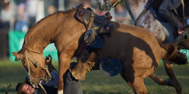 Home / Photo / Montevideo, Uruguay A gaucho, or South American cowboy, falls from his horse during the Criolla week rodeo festival