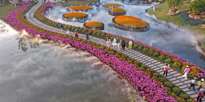 Nanning, China A drone photo shows tourists enjoying flowers at the Qingxiu mountain scenic area in Guangxi