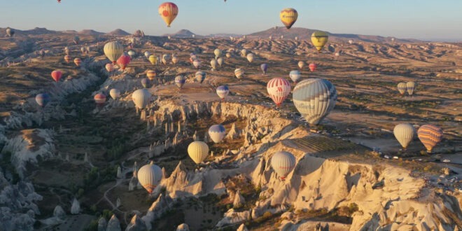 Home / Photo / Nevşehir, Turkey Hot-air balloons fly over the fairy chimneys and valleys of Cappadocia, a Unesco world heritage site