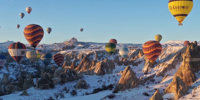 Nevşehir, Turkey Hot-air balloons glide over snow-covered fairy chimneys in Göreme, a town in the Cappadocia region