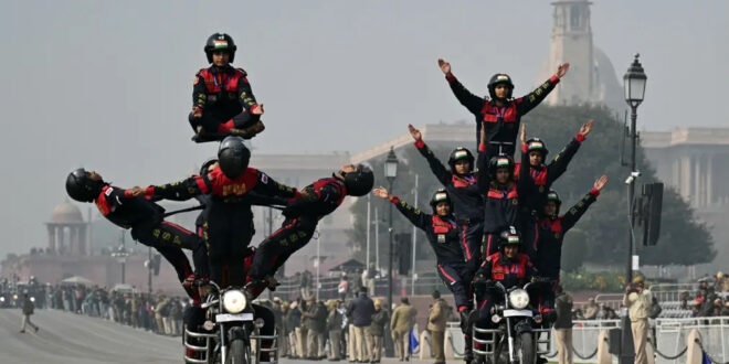 New Delhi, India The border security force’s all-female motorcycle daredevil team perform a stunt during a rehearsal for the Republic Day parade