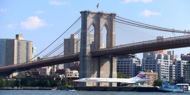 Home / Photo / New York City, US A BA Concorde from the Intrepid Museum passes under the Brooklyn Bridge on the way for restoration
