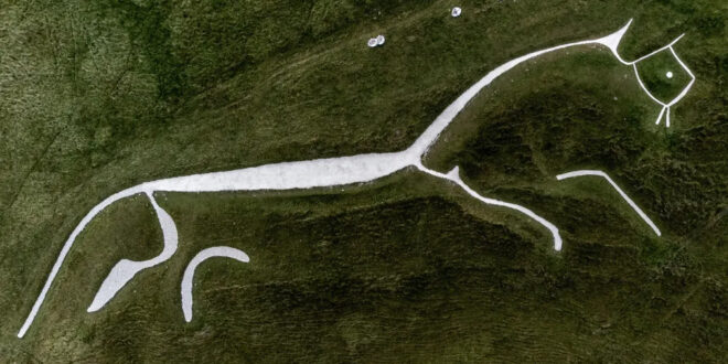 Home / Photo / Oxfordshire, UK The Uffington White Horse after a phase of conservation work by the National Trust. Erosion and bad weather have caused the Bronze Age chalk carving to shrink over the decades. The artwork measures 111-metres long from head to tail and depicts a white horse