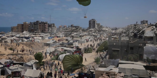 Palestinians rush to collect humanitarian aid airdropped by parachutes into Gaza City