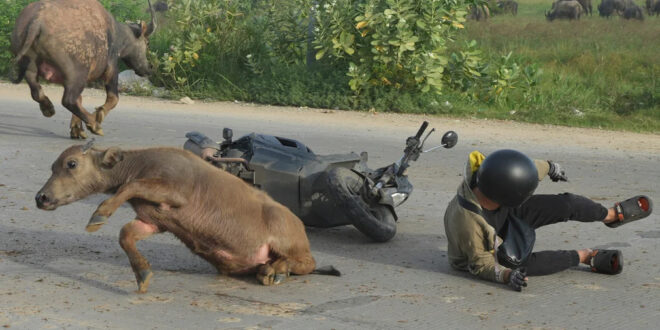 Phnom Penh, Cambodia A motorcyclist sprawls in the road after hitting a water buffalo on his way to work. Cambodian animal owners have been warned they could face jail if relatives of those who die or are injured in accidents involving their animals initiate legal proceedings