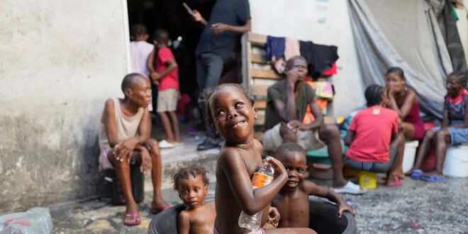 Port-au-Prince, Haiti Children bathe at a makeshift shelter for people displaced by gang violence