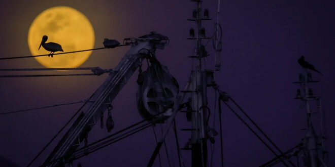 Puerto Caimito, Panama A pelican is silhouetted against the first full moon of the year