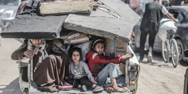 Rafah, Gaza Children sit on a truck as Palestinians continue to depart from the eastern neighbourhoods of Rafah